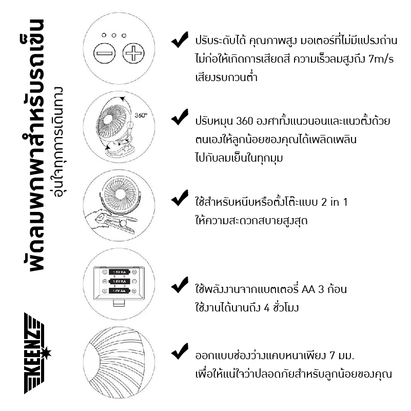Keenz Premium stroller Fan ✅ ขนาด 15.2x12.6x19.8 cm ✅ ใช้งานร่วมกับถ่าน AA Pairdear (แถมฟรี 4 ก้อน) ✅ สาย USB สำหรับต่อกับ Power bank ✅ ขนาดพกพา น้ำหนักเบา ใช้งานง่าย ✅ ปรับระดับได้ 3 ระดับ คุณภาพสูง มอเตอร์ที่ไม่มีแปรงถ่าน ไม่ก่อให้เกิดการเสียดสี ความเร็วลมสูงถึง 7m/s เสียงรบกวนต่ำ ✅ ปรับหมุน 360 องศาทั้งแนวนอนและแนวตั้งด้วย ตนเองให้ลูกน้อยของคุณได้เพลิดเพลิน ไปกับลมเย็นในทุกมุม ✅ ใช้สำหรับหนีบหรือตั้งโต๊ะแบบ 2 in 1 ให้ความสะดวกสบายสูงสุด ✅ ใช้พลังงานจากแบตเตอรี่ AA 3 ก้อน ใช้งานได้นานถึง 4 ชั่วโมง ✅ ออกแบบช่องว่างแคบหนาเพียง 7 มม. เพื่อให้แน่ใจว่าปลอดภัยสำหรับลูกน้อยของคุณ